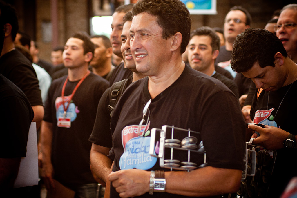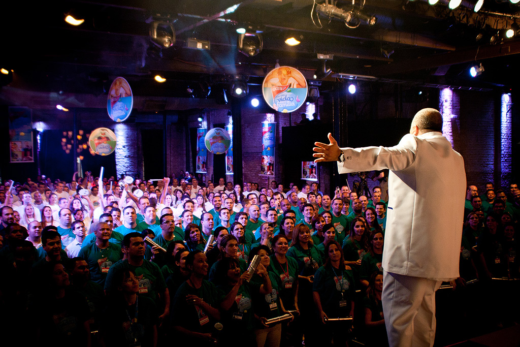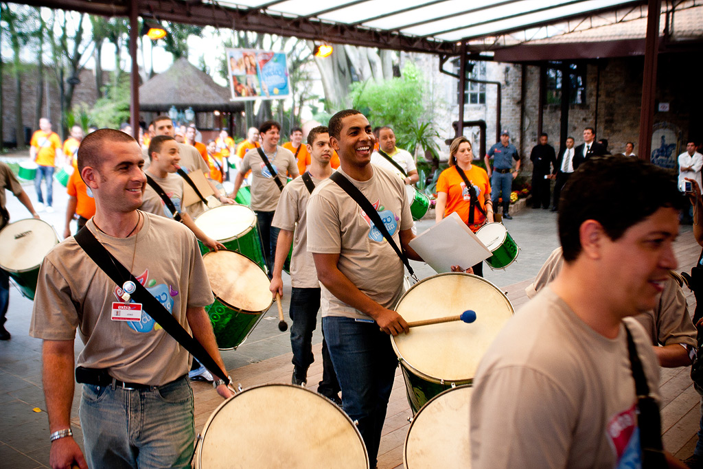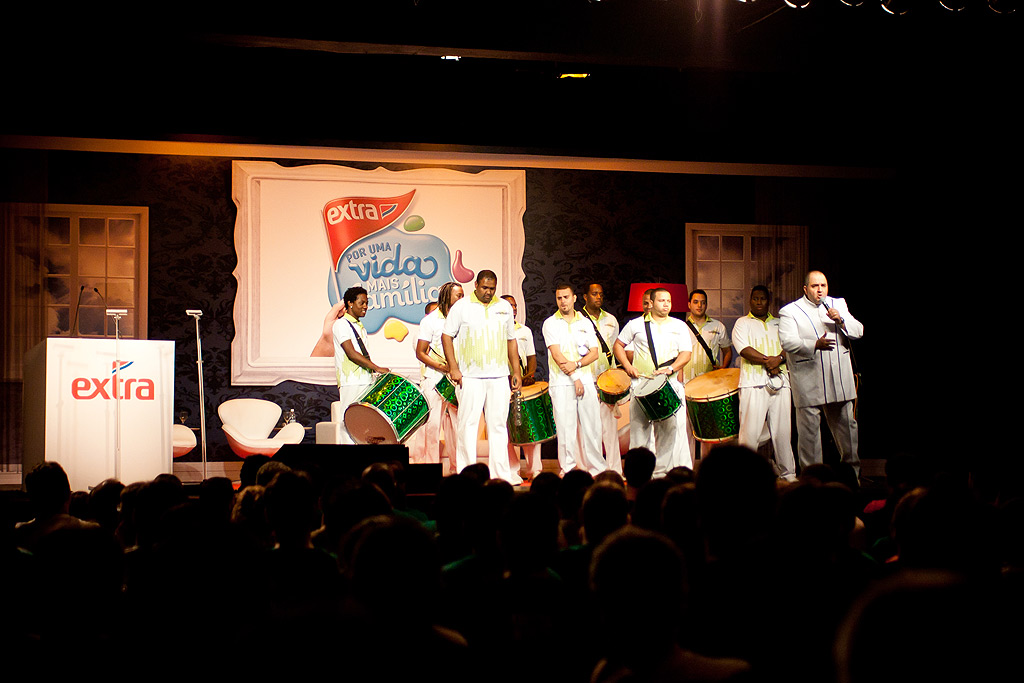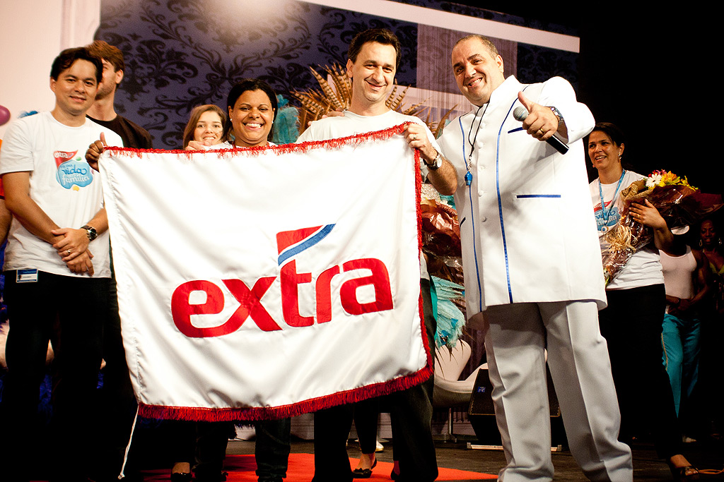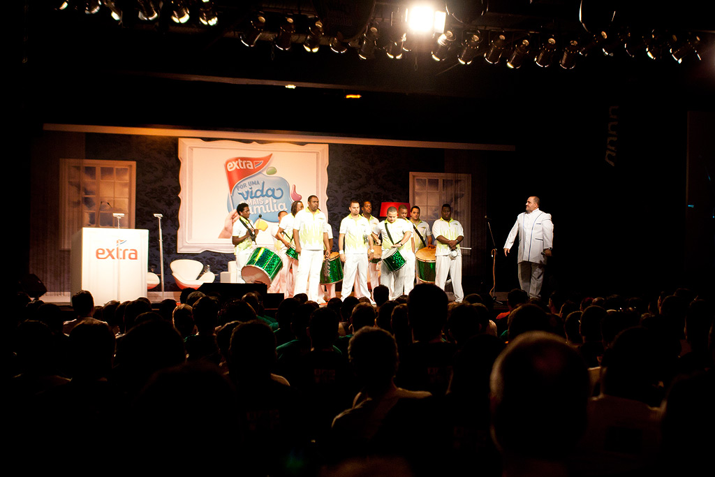 A dinâmica escola de samba realizada na convenção do Extra foi um sucesso.