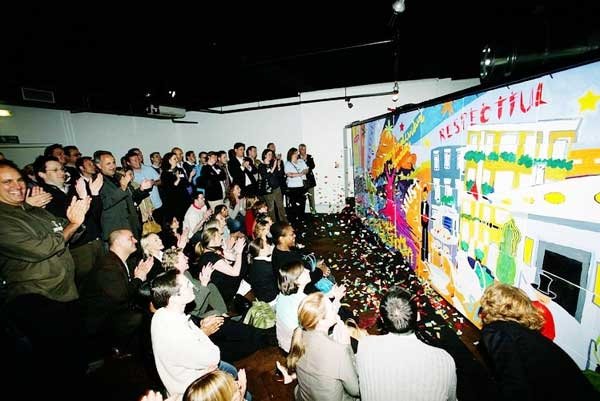 - Uma vez que estejam completas, todas as telas serão montadas numa moldura gigante e ocultas por uma cortina.